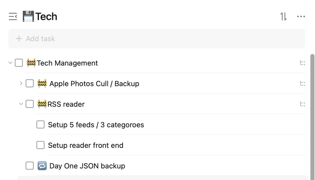 One example of using this is that within my “Techlife” area I have tasks like “HomeAutomation”, and then within that I have tasks like “Washing Machine Shake detection”, or “Auto kitchen fan when stove turns on”.