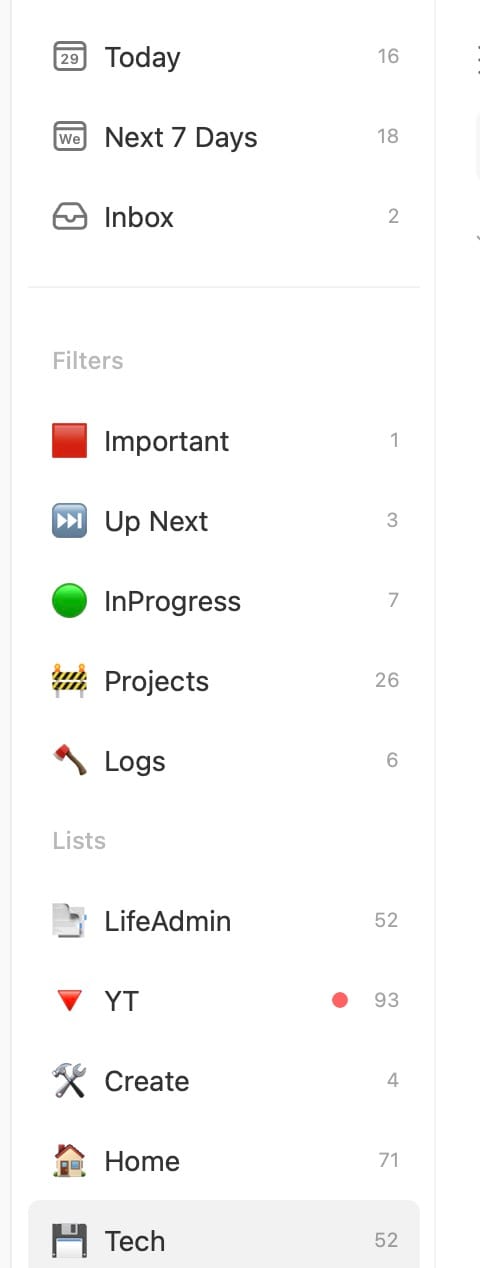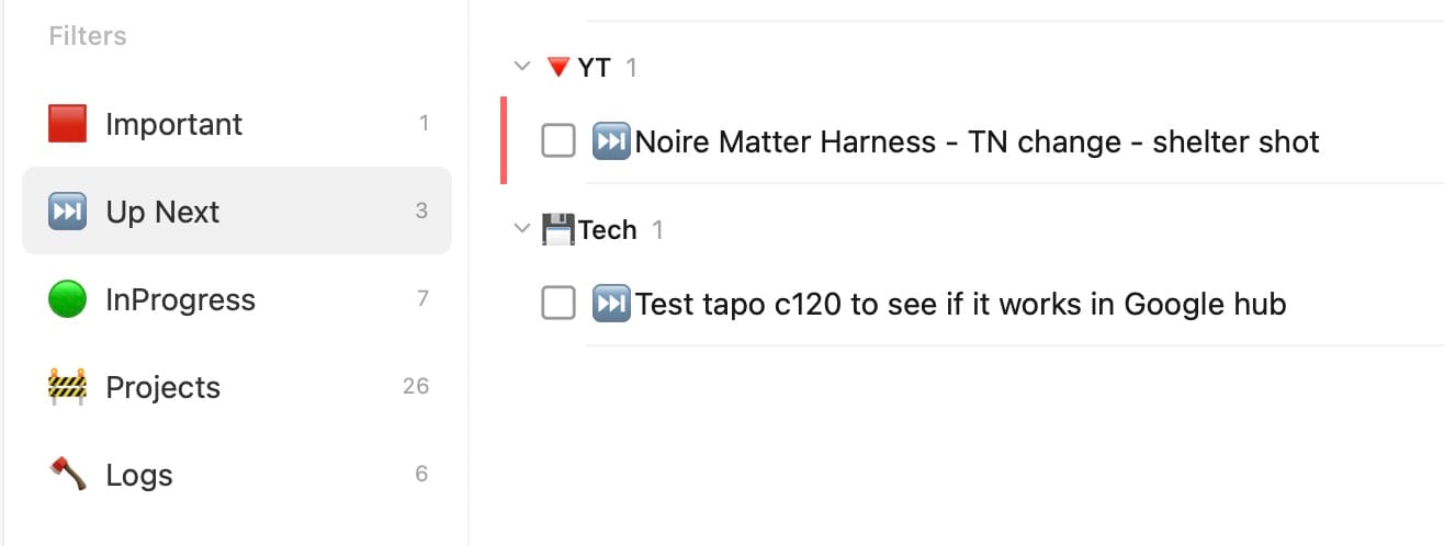 Next is filters. I had originally started using tags, but I didnt like the UI for adding tags to tasks. Filters allow you to just use an emoji at the beginning of your task, and then it will show up in that filtered list. It makes that type of task very visible in a longer list of tasks, so it’s faster to find them.