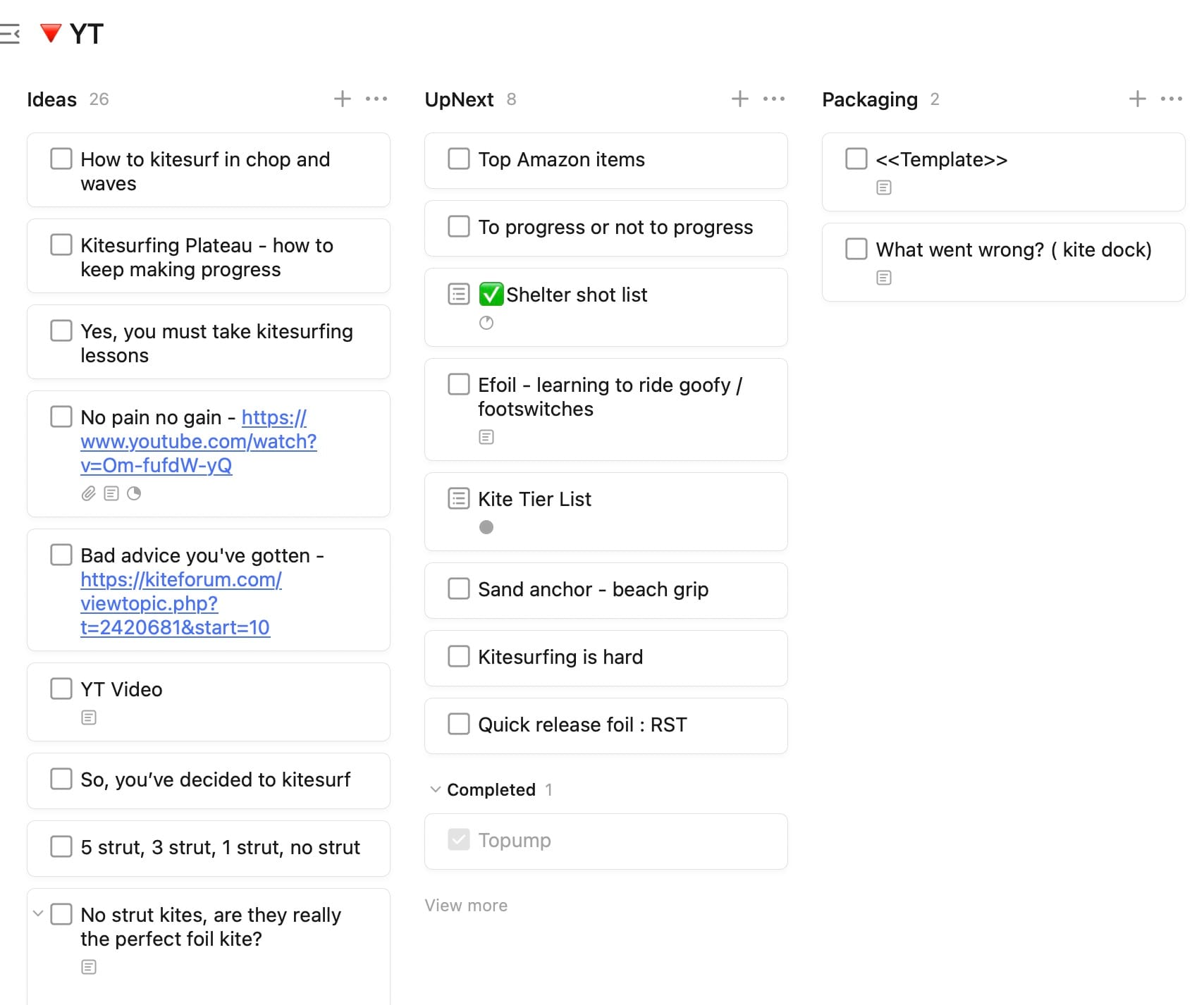 I have a section where I save all my ideas for future videos, and as I work them through my production process I move them through the different lists in the kanban view.