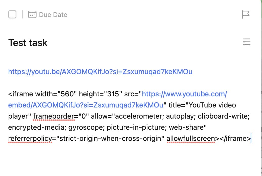 Similar to the above, i like to store a lot of visual information with my tasks, and a lot of useful information comes from YouTube. Sure I can paste a link and an image of a screenshot of a video, but it’s not nearly as fast as just embedding the video directly.