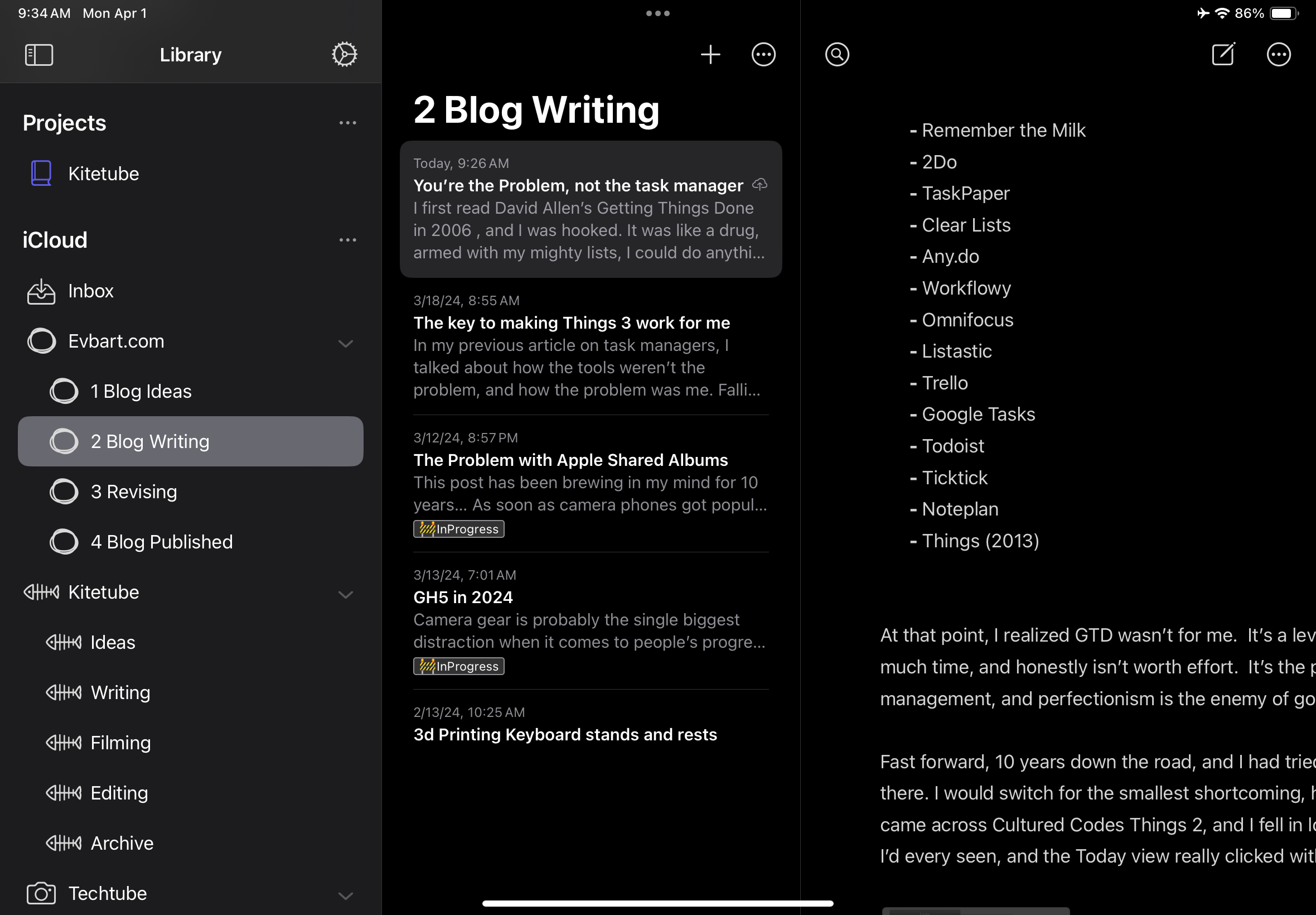 I delayed learning how I think about tasks, how I process work, how I prioritize, how I schedule work.. and I did this in exchange for what I thought was going to be the perfect task system with the perfect task application. Yet again, the delay was not worth it, I would have been better off using an imperfect system. I would have learned a lot more, and I’d be more productive today.