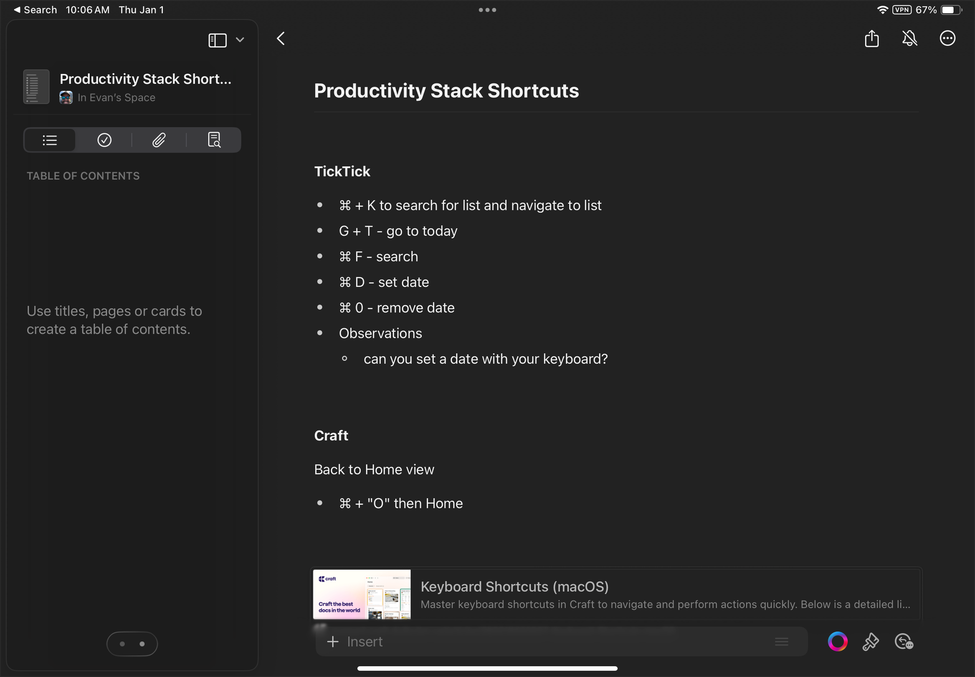The thing that drove me to craft to begin with was the native macOS and iOS apps, and the incredible rich formatting of text. Craft still has the best swipe-to-indent feature of any notes app on iOS. You can write a bullet point list quickly and just swipe left or right to indent and structure that last.