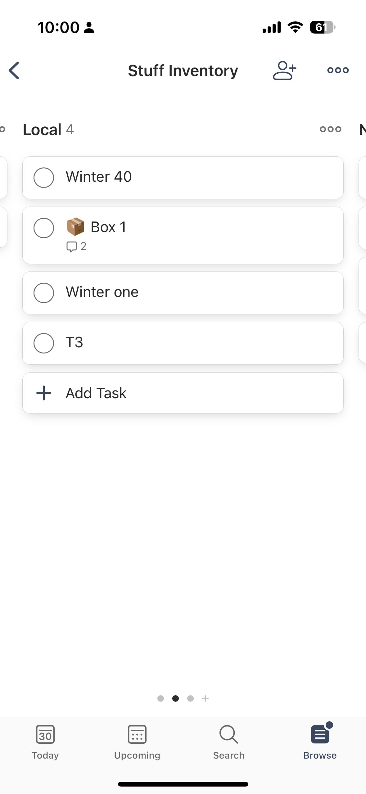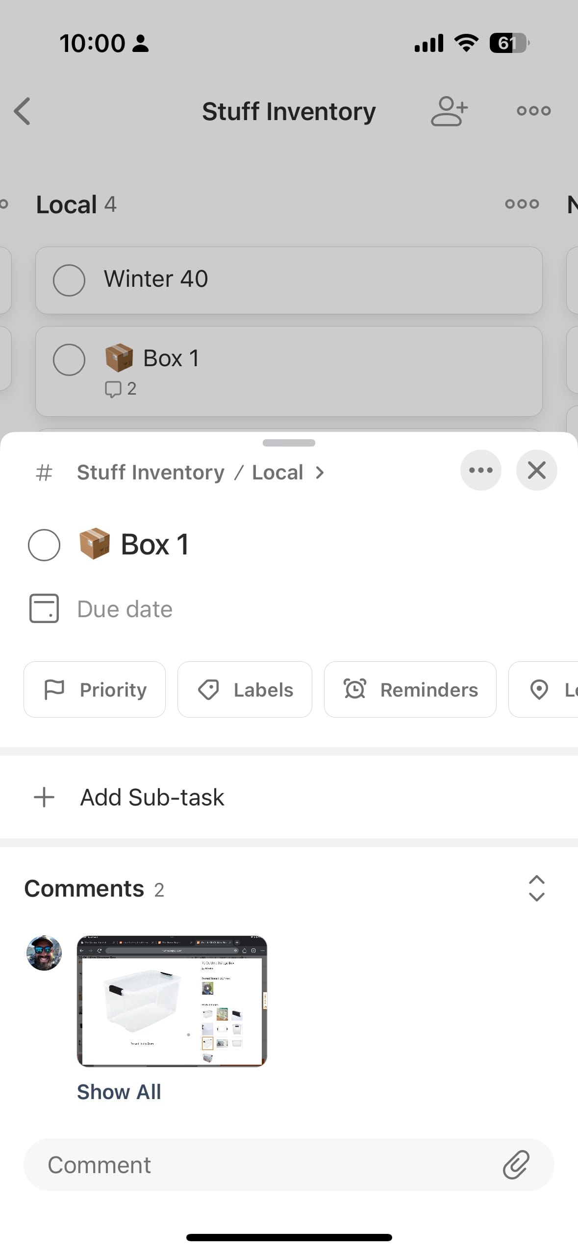 - Subtasks - this allows me to create a parent task called “Box 1” and then put subtasks in that box.