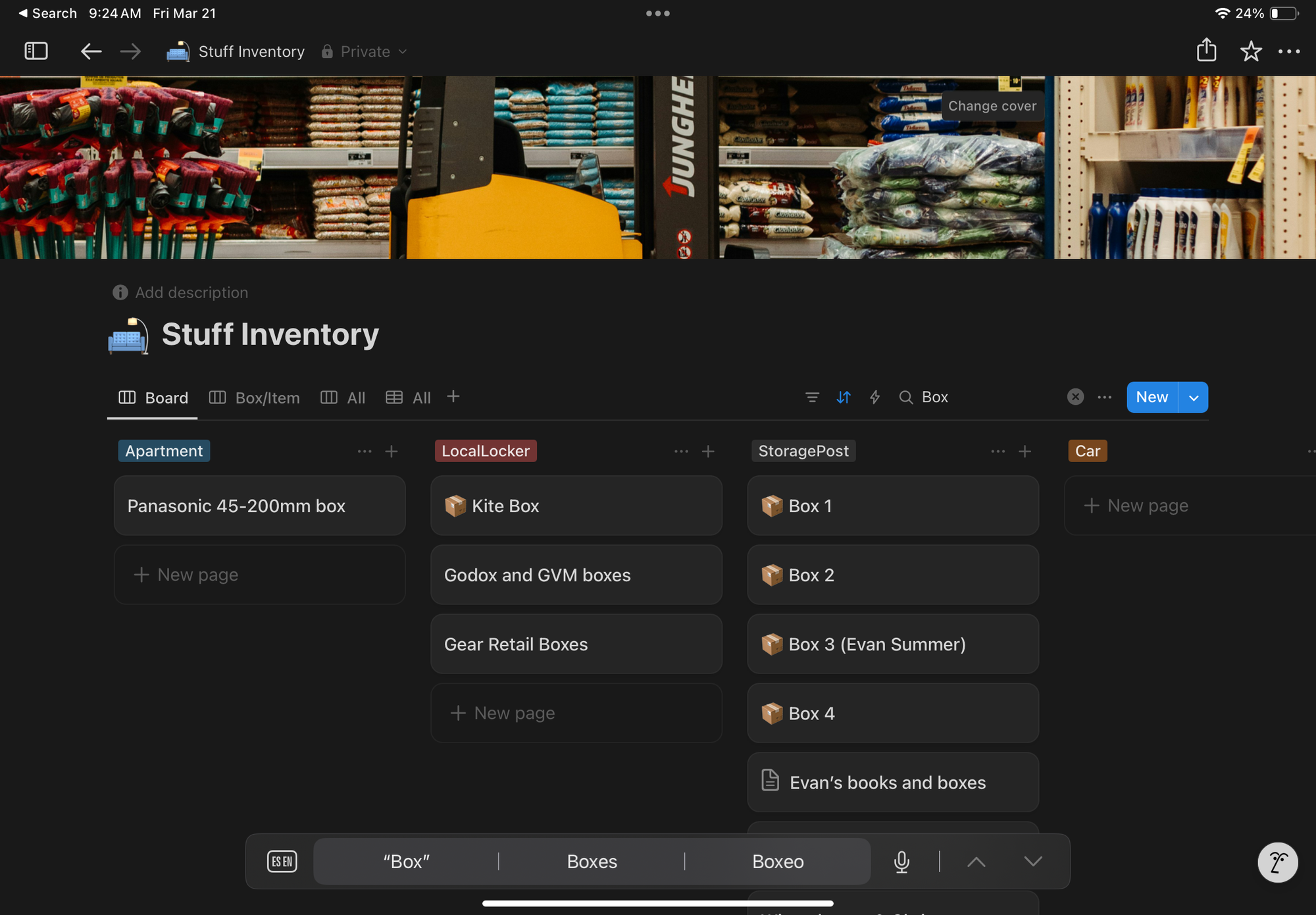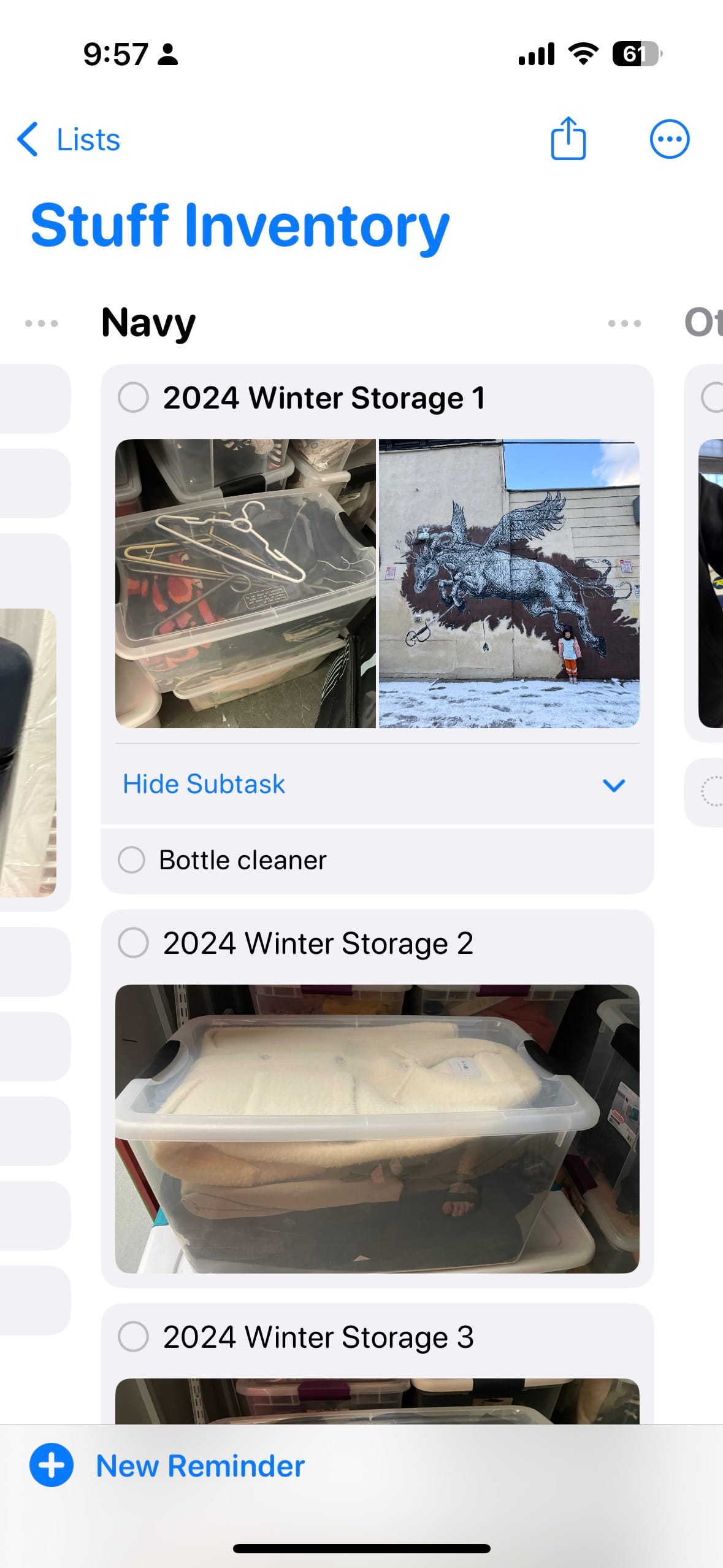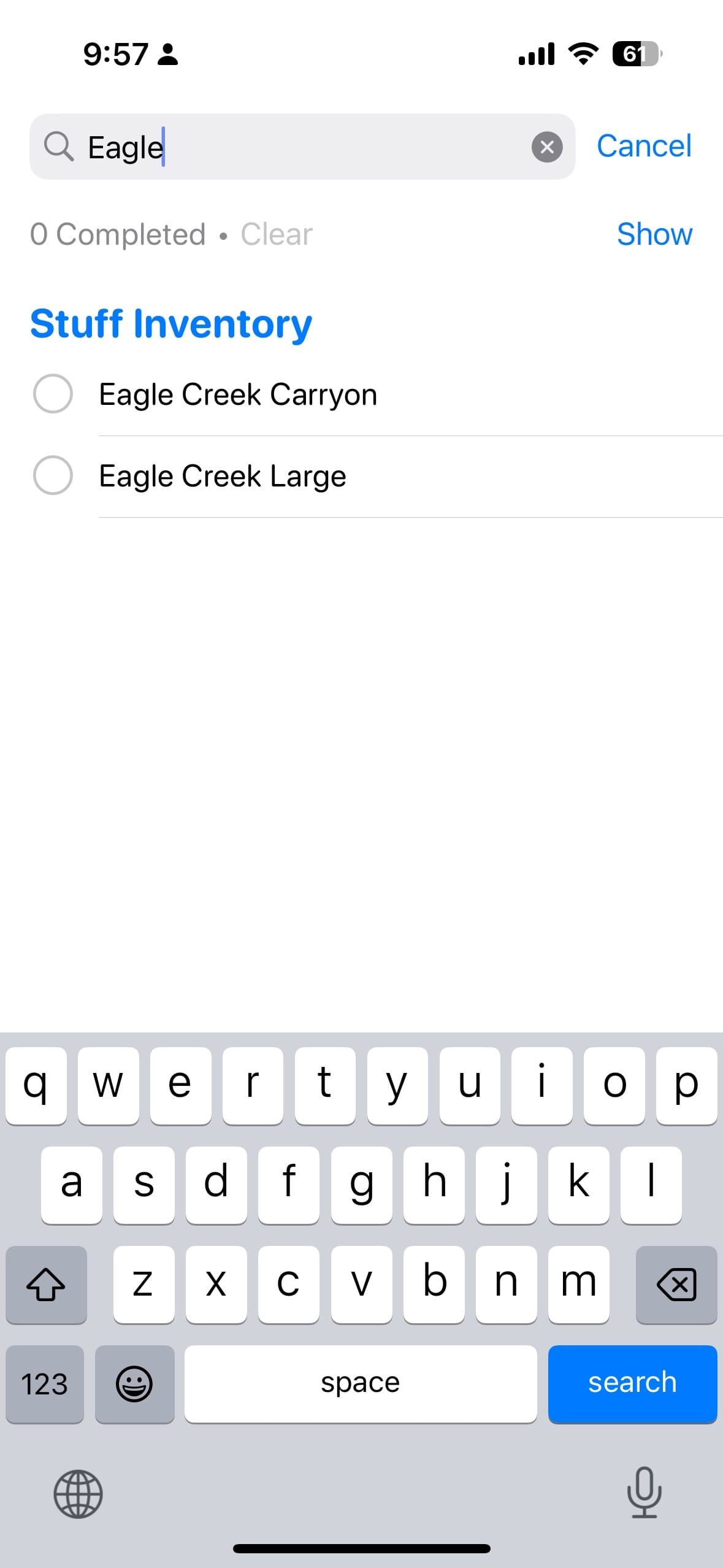 The fatal flaw for Apple Reminders is its search functionality, it doesn’t really work with its Kanban feature. Sometimes if you search, you don’t get a result at all. For example, I have two boxes called “Winter box”, but a search for “Winter” doesn’t return anything at all. The other issue is that a search will not show you what kanban list an item is in. So if I search for “SUP”, I’ll see the two SUP items, but I can’t tell if they are in my “apartment” kanban list or in my “storage unit” kanban list. If I search for an item, it will show the item, but it won’t show which kanban list it's in. This is a dealbreaker because I could have 100s of items in storage or in my home, and if I can’t tell where it is, that defeats the entire purpose of search.