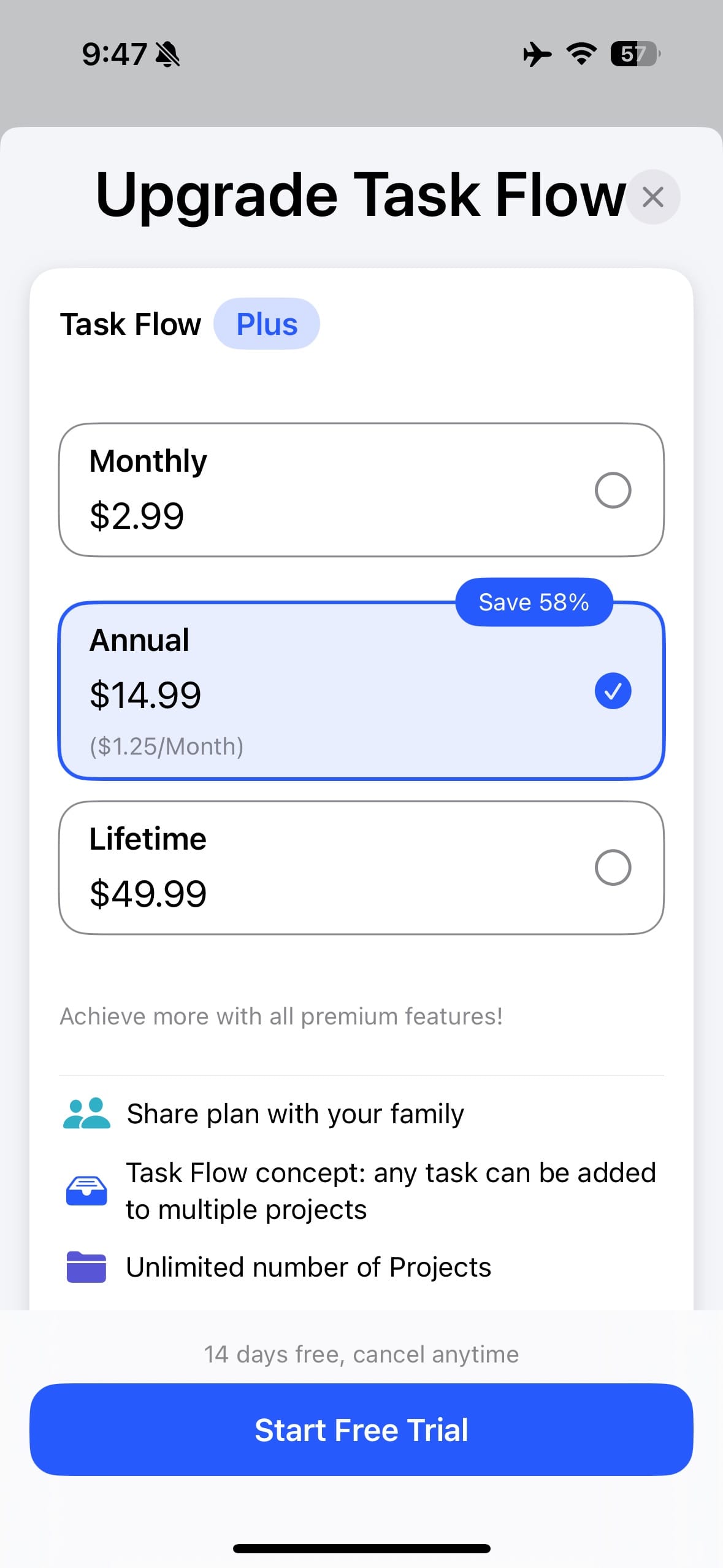 The next app that I found that could do these things is Task flow. The main advantage here is they have a low annual subscription price and a lifetime purchase option that would keep the long-term cost of ownership low.