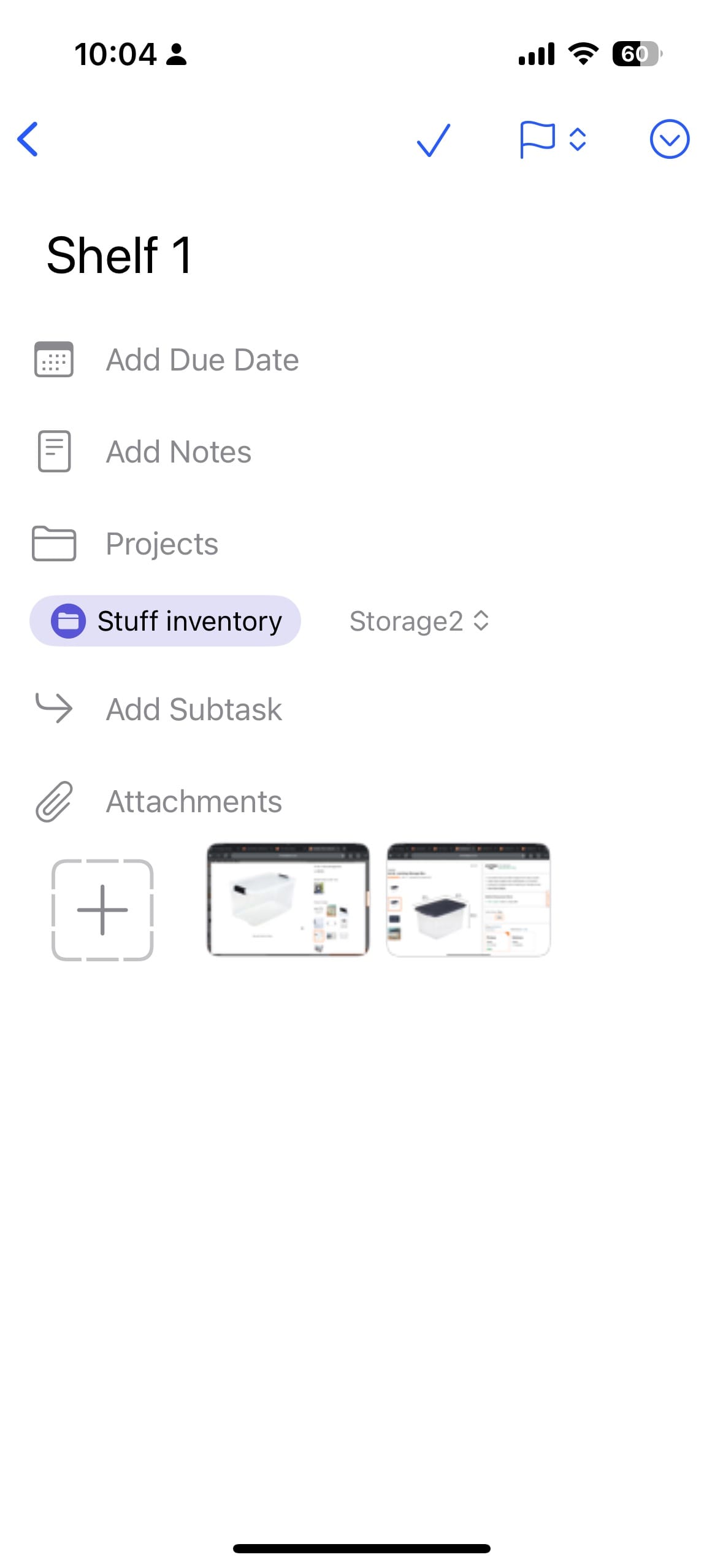 You can add multiple photos quickly, and they get added to the text area within each task. Then you can nest tasks within each other, and you can nest multiple layers deep. Once way you could use this nesting is for putting specific items inside other items; Shelf 1 >> Box 1 >> Specific item.